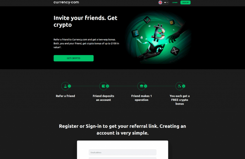 Großartiges Empfehlungs- und Partnerprogramm: Wenn Sie etwas Geld verdienen möchten, indem Sie Ihre Freunde oder Familienmitglieder werben, können Sie dies ganz einfach mit dem Currency.com Empfehlungsprogramm tun. Sowohl Sie als auch Ihr Freund können bis zu $100 verdienen, wenn diese sich über Ihren Link auf der Plattform anmelden. Die Belohnungen hängen davon ab, wie viel Geld Ihre Empfehlung einzahlt und welche Art von Operation sie durchführt. Beachten Sie, dass Currency.com Kryptowährungen als Empfehlungsprämien anbietet, anstatt Ihnen Fiat-Währungen zu geben.